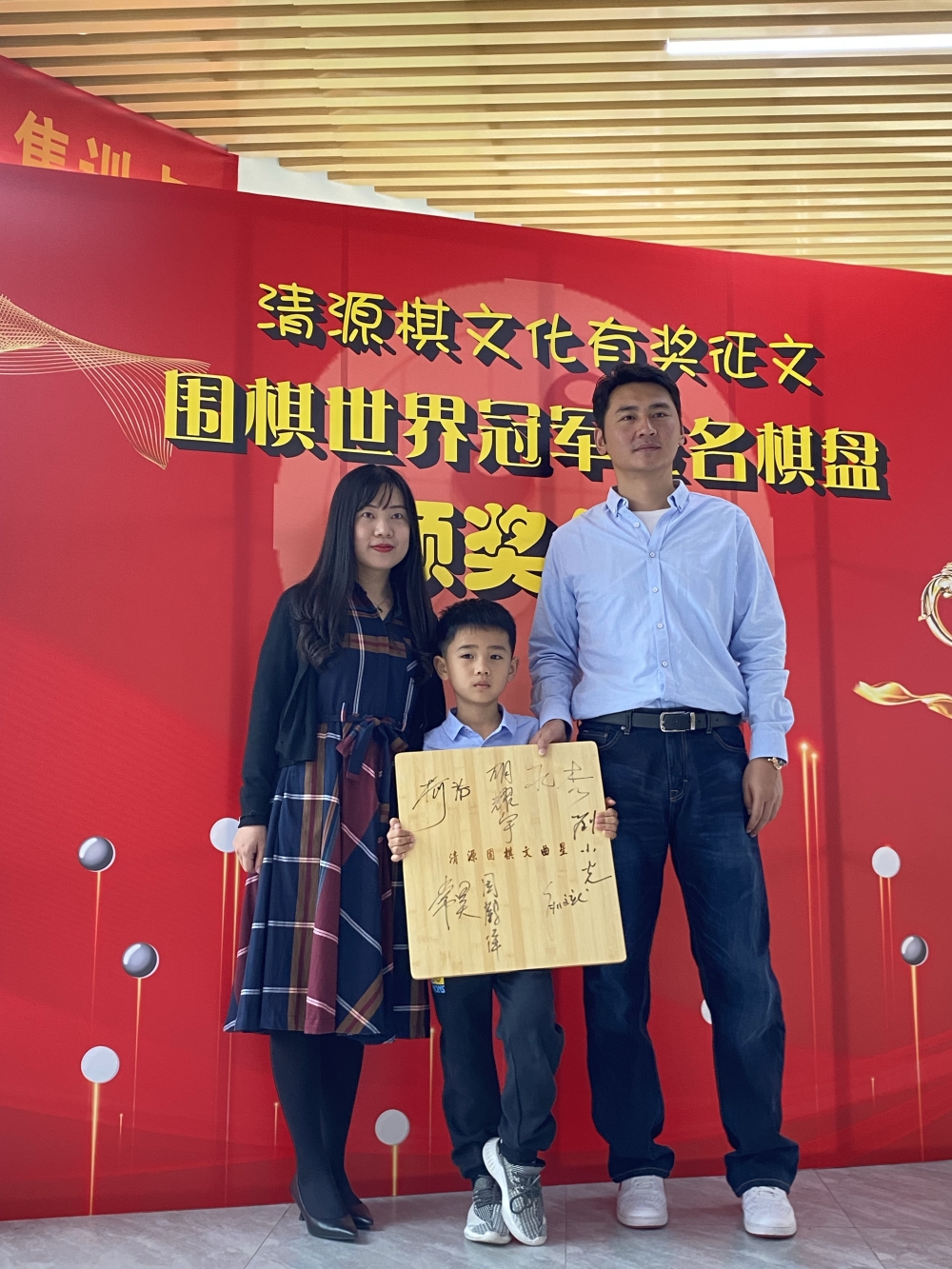 小棋童與爸爸媽媽合影留念,分享獲獎的喜悅和榮譽。